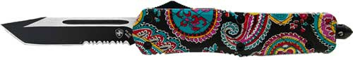 The Templar Knife Small OTF Quilt is a compact and versatile blade featuring a unique quilt design on the handle. The black tanto blade is crafted for precision and strength, with a serrated edge for added cutting power. Perfect for everyday carry or tactical use.
